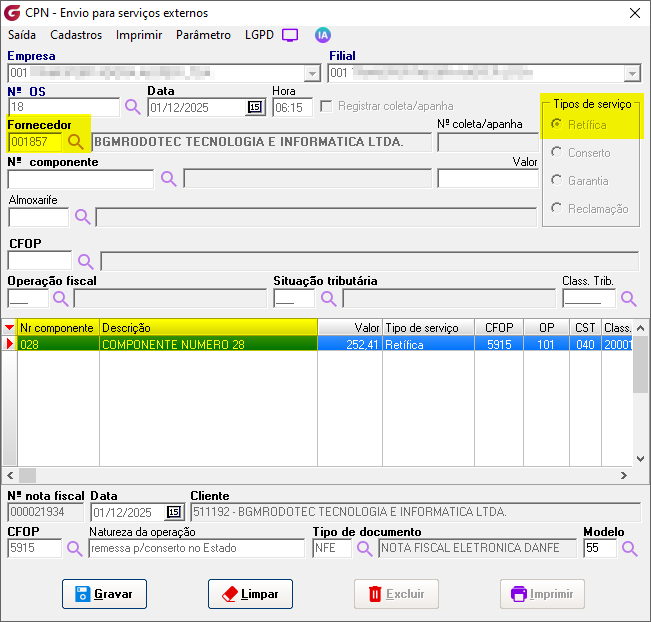 Módulo:Componentes (CPN) Caminho de acesso: >Parâmetros >Componente >Cadastros >Componentes >Movimentações >Envio para serviço externo >Movimentações >Recebimento de serviço externo |