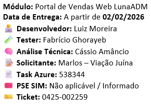 Imagem 02 ![]() Imagem 03 ![]() Imagem 04 ![]() Imagem 05 ![]() Ilustrações acima do caminho do novo parâmetro, como também das rotinas já existentes de solictação de autorização de reimpressão e dos novos alertas ao operador quando não solicitado ou não aprovada. *Portal Web Luna ADM. Nomes, documentos e telefones lançados nesse teste, são meramente fictícios. “Atendendo assim as normas da LGPD”. |