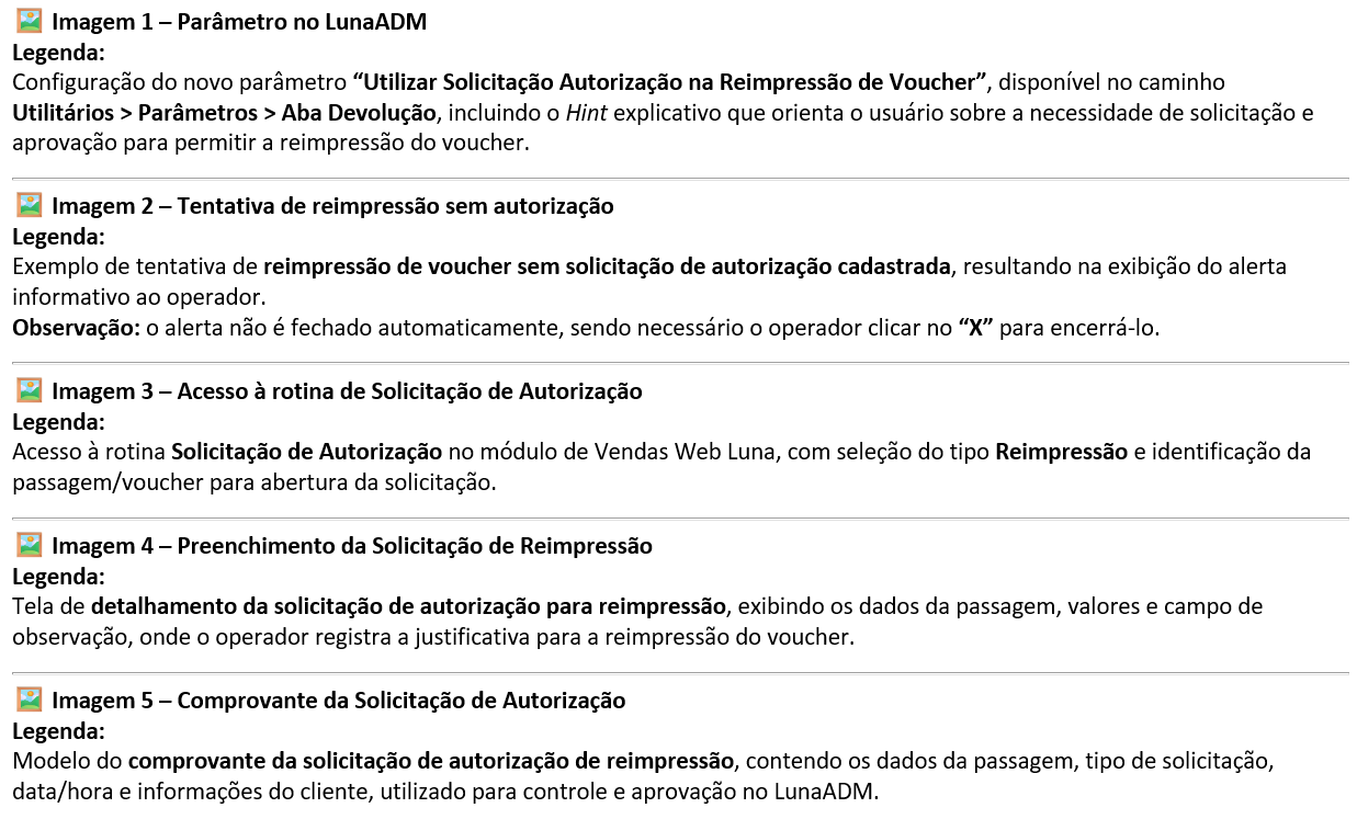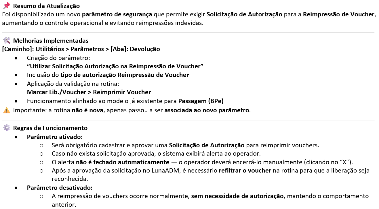 Caminho de acesso: Luna ADM [Caminho]: Utilitários > Parâmetros > [Aba]: Devolução > “Utilizar Solicitação Autorização na Reimpressão de Voucher” |