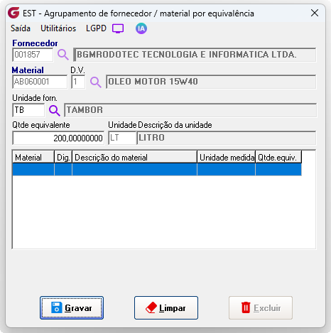 Caminho de acesso: >Cadastros> Agrupamento >Fornecedor material - equivalência |