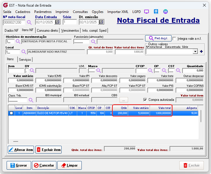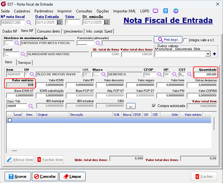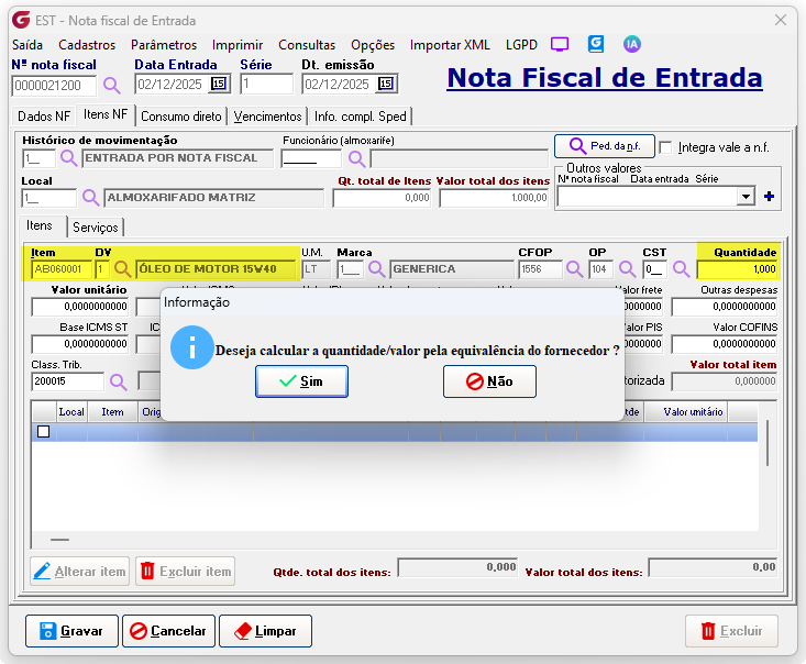 Cadastros> Agrupamento >Fornecedor material - equivalência Fornecedor - Digite o código do fornecedor ou selecione pelo botão de pesquisaMaterial - Digite o código do material ou selecione pelo botão de pesquisa Unidade forn. - Unidade de medida utilizada pelo fornecedor Qtde equivalente - Quantidade equivalente pela unidade utilizada pelo sistema Unidade Descrição da unidade - Unidade de medida utilizada pelo sistema Na entrada por nota fiscal, ao informar o material com equivalência associada ao fornecedor, é solicitada a confirmação de uso da equivalência. ![]() Digite a quantidade e valor informados na nota fiscal, ![]() O sistema fará a conversão da quantidade e do valor unitário.