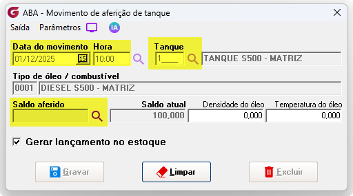 Módulo: Abastecimento (ABA) Caminho de acesso: >Movimentações> Aferição de tanque |