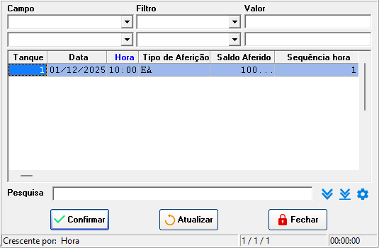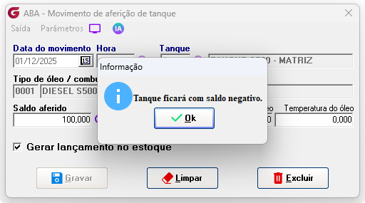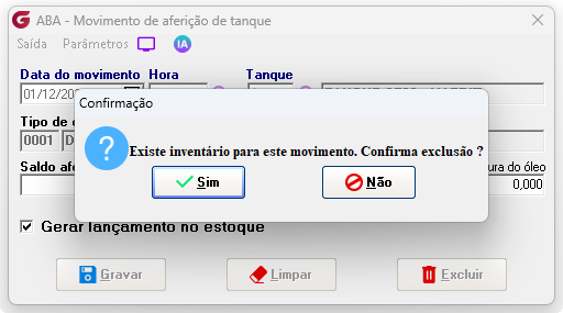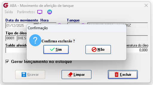 Rotina para realização de exclusão de aferição em tanques de combustíveis e lubrificantes. Movimentações> Aferição de tanque Na rotina de aferição do tanque informe a data, hora e tanque que deve ser excluído