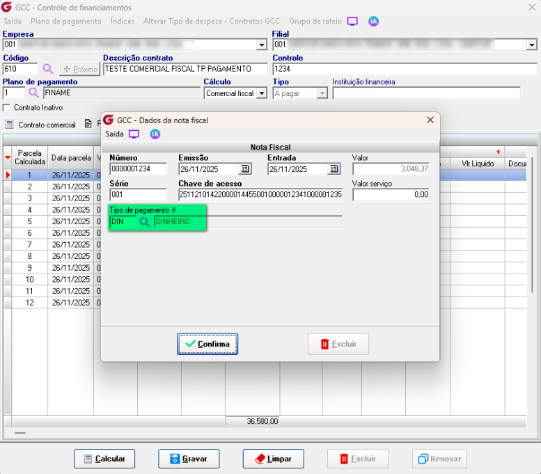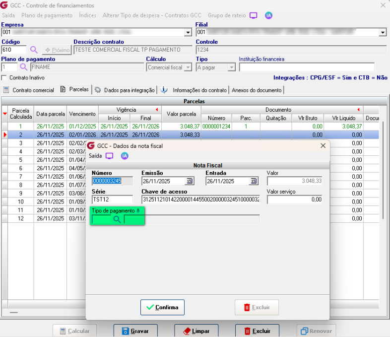 1 - Inclusão de uma nota fiscal em contrato Comercial Fiscal utilizando tipo de pagamento.