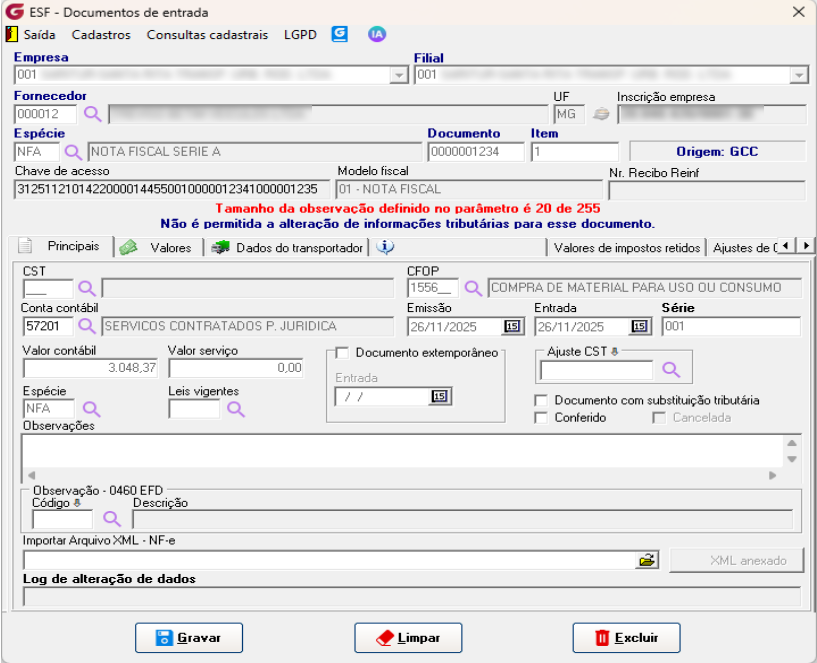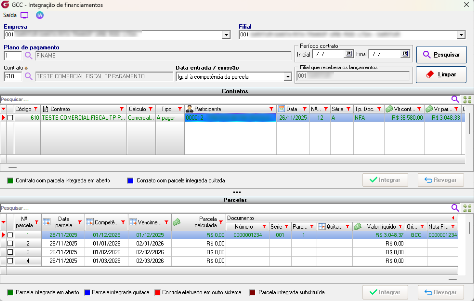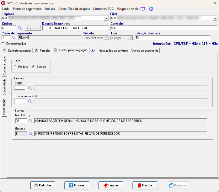 A respectiva nota fiscal do contrato será integrada normalmente para a Escrituração Fiscal.