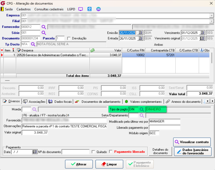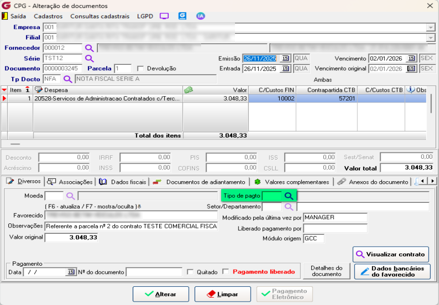 O tipo de pagamento será exibido na tela de alteração de documentos do módulo Contas a Pagar.