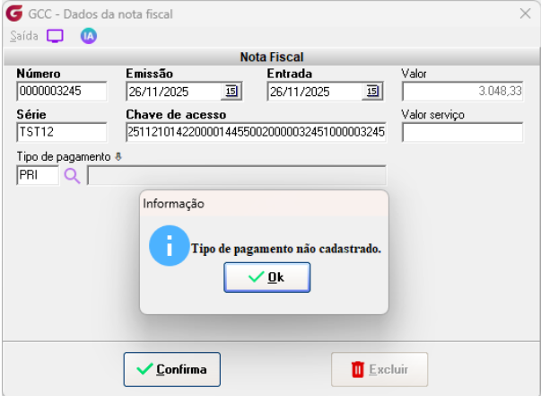 Caso o tipo de pagamento informado seja inexistente, apresentaremos a mensagem abaixo: