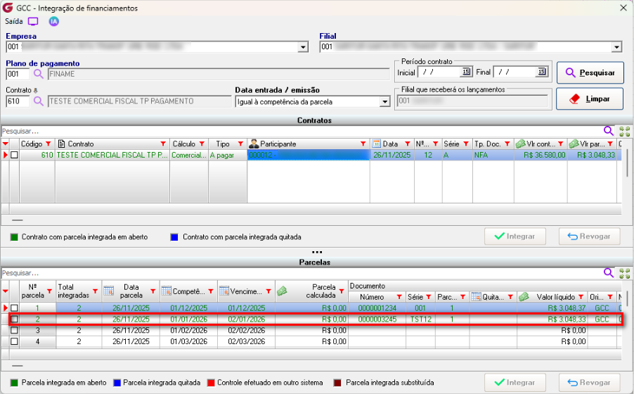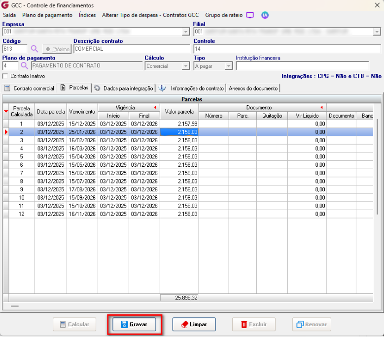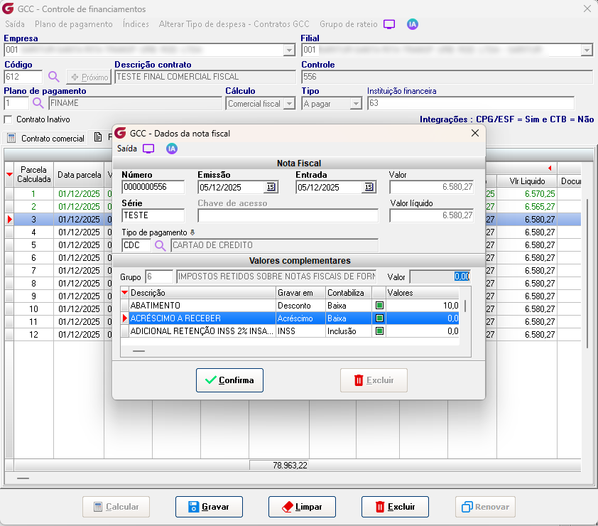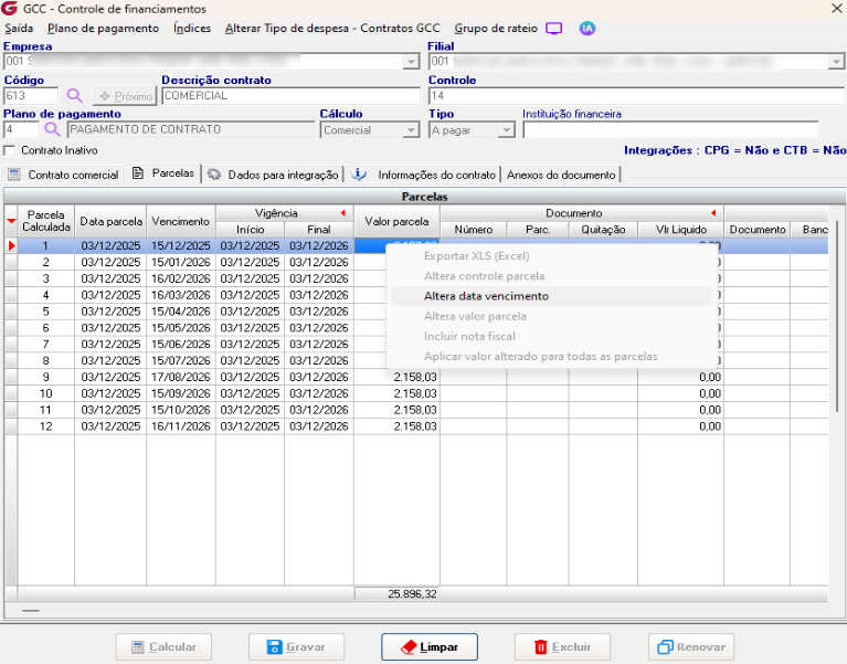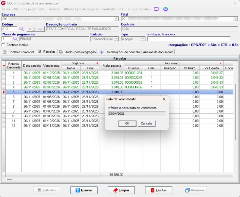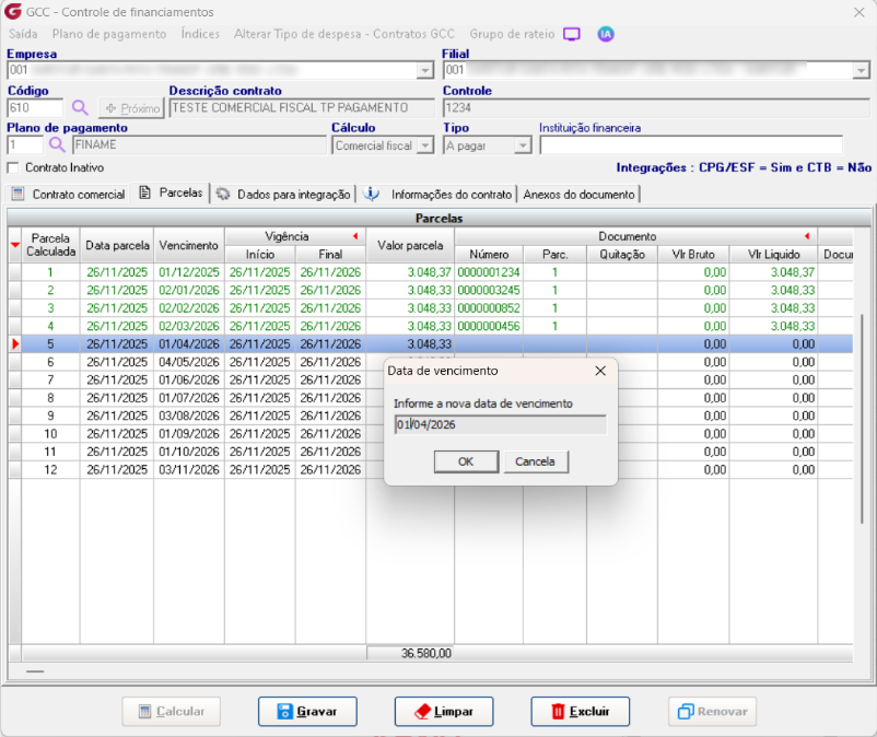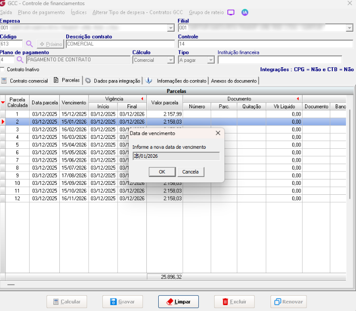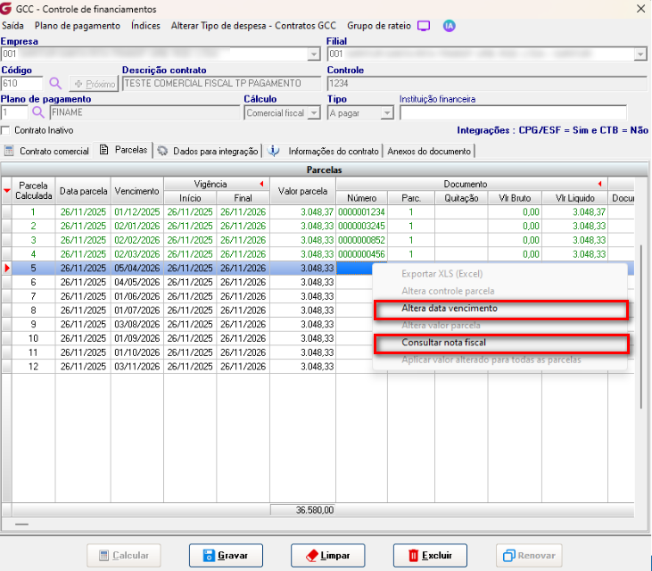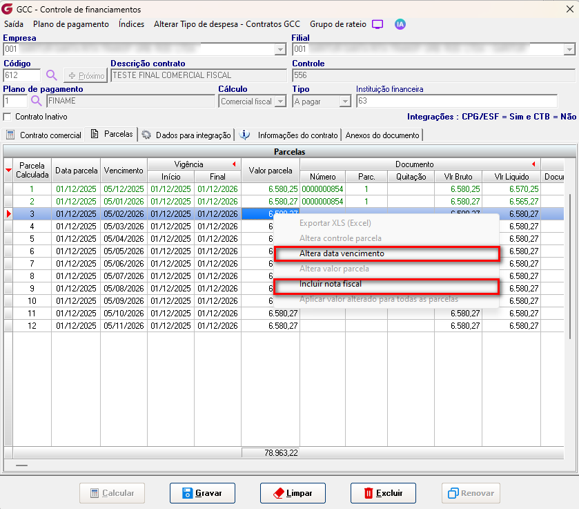 O sistema passou a permitir que a data de vencimento será alterada e também inclusão e alteração de notas nas parcelas do contrato Comercial Fiscal.