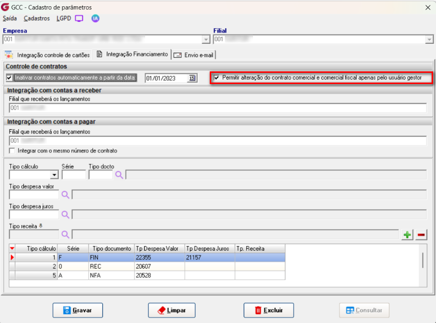3 - Quando marcada a opção "Permitir alteração do contrato comercial e comercial fiscal apenas pelo usuário gestor" no cadastro de parâmetros o sistema permitirá que demais usuários alterem as datas de vencimento das parcelas e, sendo contrato Comercial Fiscal, inclusões e alterações de notas fiscais.