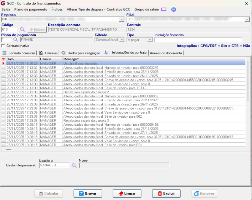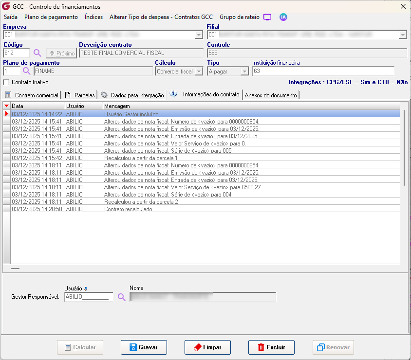 Efetuamos login com usuário diferente do usuário gestor do contrato, na consulta dele podemos perceber que vários dados entre as abas ficam bloqueados para alteração.