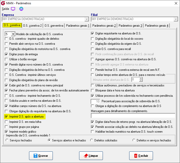 Parâmetros> Manutenção> Parâmetros gerais 1 ![]() Movimentação> Abertura de O.S. corretiva Com o parâmetro marcado, no momento de gravação da ordem de serviço corretiva, a rotina de impressão é enviada automaticamente à impressora configurada.