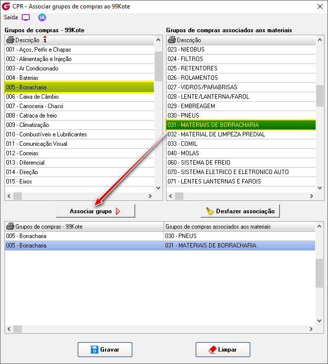 99Kote >Cadastros> Associar grupo de compras Selecione o grupo de compras do 99Kote em seguida selecione o grupo de compras associados aos materiais do Globus e clique no botão "Associar grupo". Associe quantos grupos forem necessários