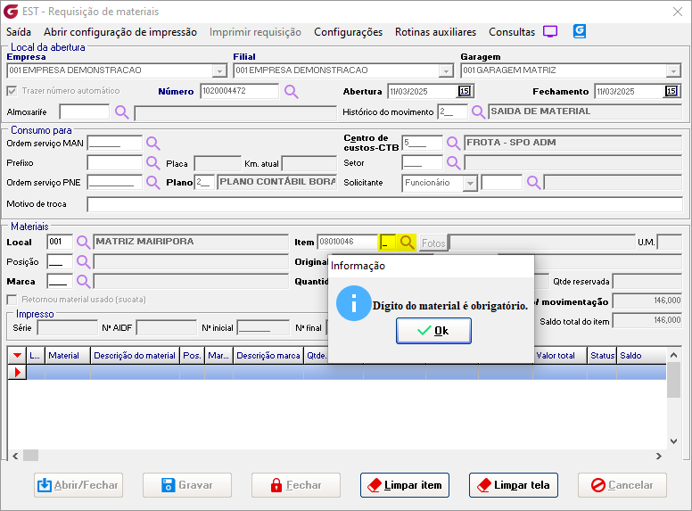 Solicitar dígito verificador na movimentação de materiais Com o parâmetro marcado, nas movimentações de saída é habilitado campo obrigatório para informar o dígito verificador.