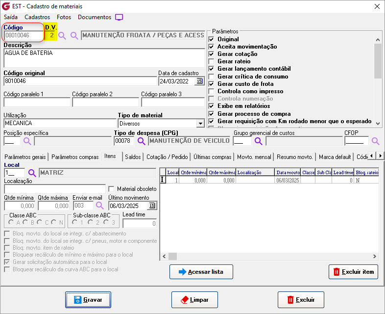 Cadastros> Materiais Deve ser digitado o código verificador gravado no cadastro do material.