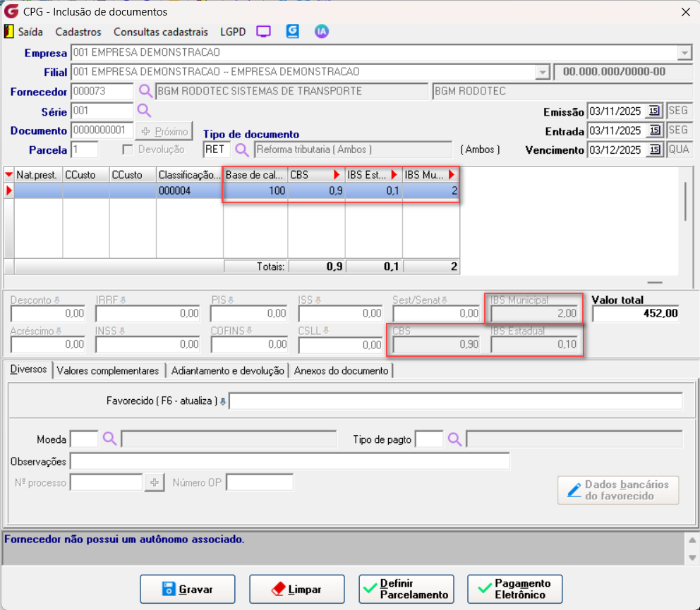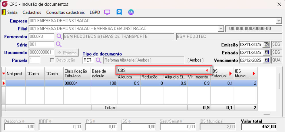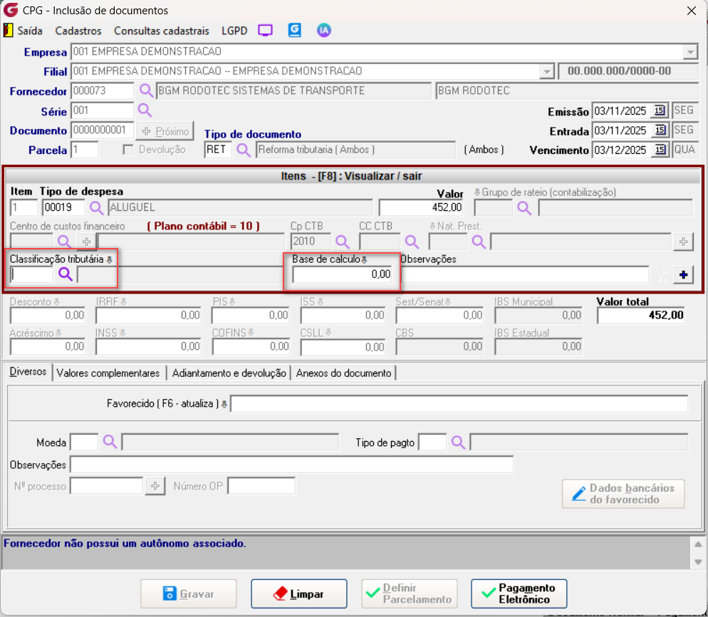 Na inclusão de documentos teremos os campos para esse cálculo por item, por isso colocamos os campos para informa a classificação tributária e a base de cálculo: