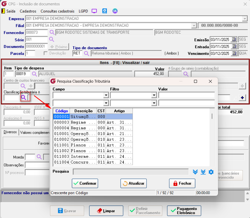 Pesquisa da classificação tributária, para não preenchimentos dos campos basta passar com seta para baixo e incluir o item sem esses dados.