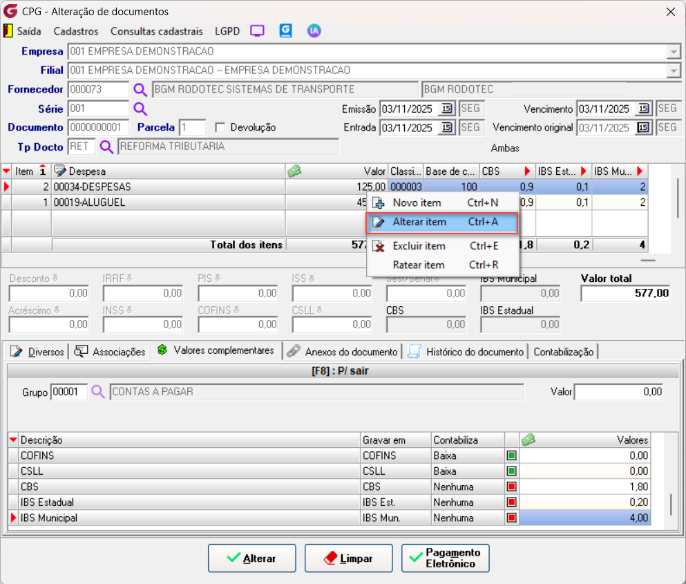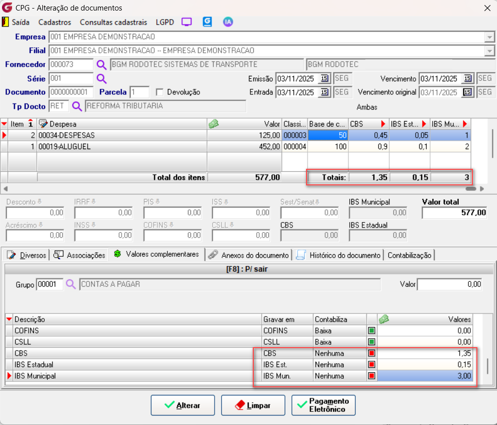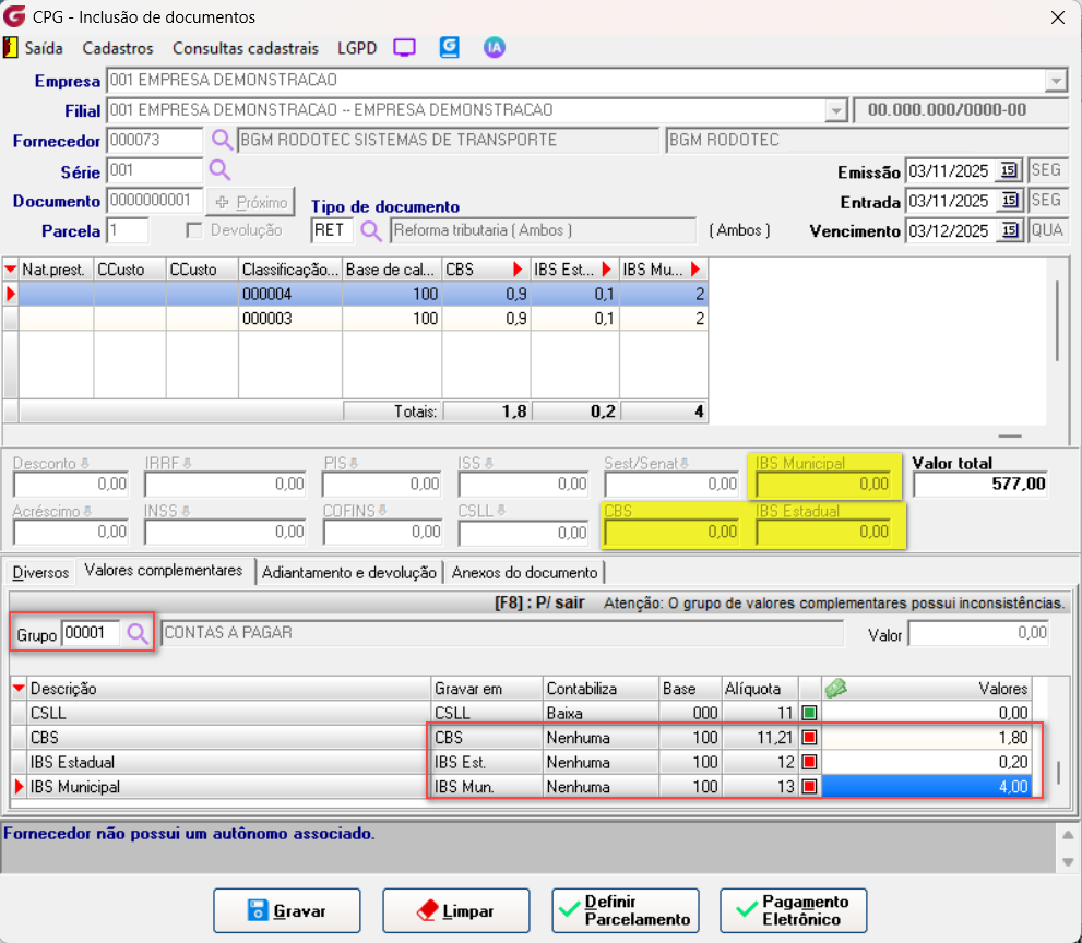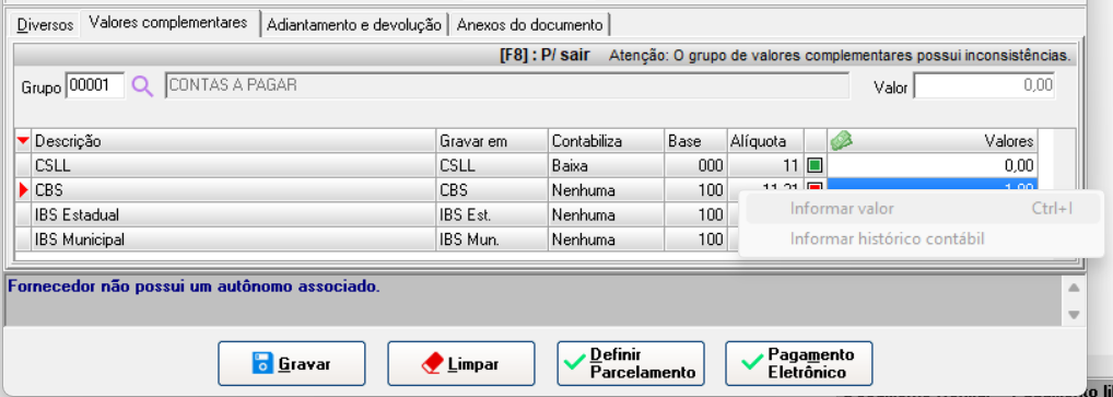 Ao informar o grupo de valores complementares deixamos de demonstrar no grid do documento.