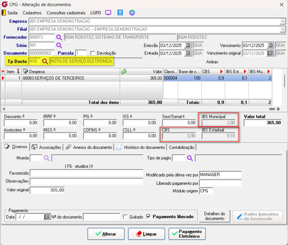 Exemplo de um documento onde o tipo de documento utilizado não tem a opção de grupo de valore complementares: