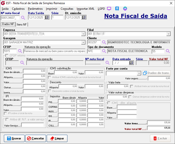 Nº nota fiscal - Nesse campo informe o número da nota Data saída - Informe a data de saída do material Série - Informe o código da série Data de emissão - Informe a data de emissão Dados NF Empresa/Filial/Garagem - Informe a empresa, filial e garagem da movimentação Cliente - Digite o código do cliente ou selecione pelo botão de pesquisa. O cliente deve ser o mesmo fornecedor que fará a execução do serviço. CFOP - Digite o CFOP ou selecione pelo botão de pesquisa. Tipo de documento - Digite o código do tipo de documento ou selecione pelo botão de pesquisa. Ao selecionar o tipo de documento como eletrônico, o número da nota fiscal de acordo com o parâmetro de nota fiscal de saída. Itens NF