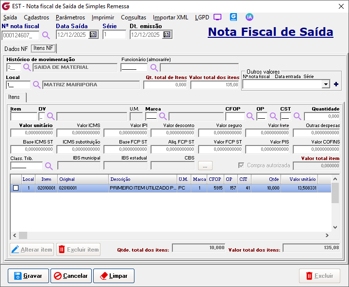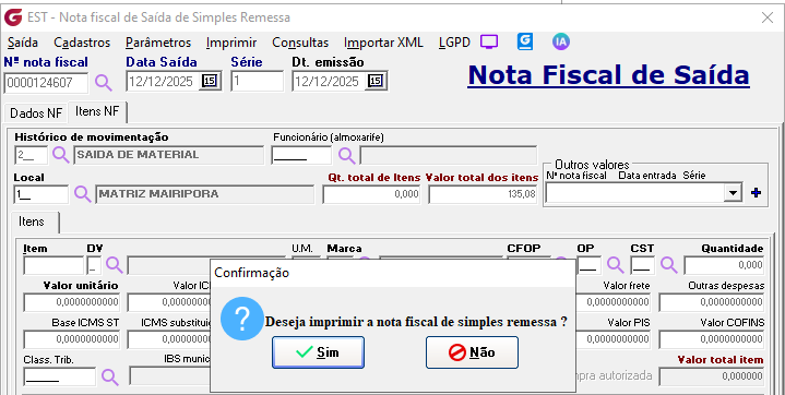 Histórico de movimentação - Informe o histórico de movimentação ou selecione pelo botão de pesquisa Funcionário (almoxarife) - Digite o código do funcionário ou selecione pelo botão de pesquisa. O preenchimento do campo é opcional Local - Digite o código do local ou selecione pelo botão de pesquisa. Itens - Preencha os dados do item que será enviodo para remessa. O valor do item é sugerido com o valor médio atual podendo ser alterado Botão Gravar - Utilize o botão para confirmar a emissão Confirme a impressão da NF-e