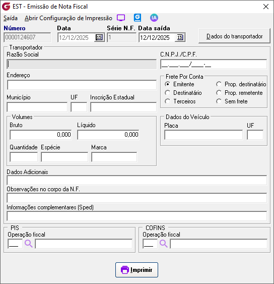 Preencha os dados de transporte se necessário e clique em imprimir