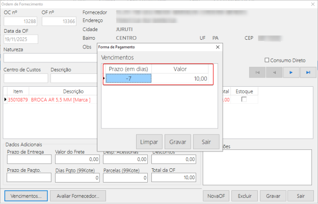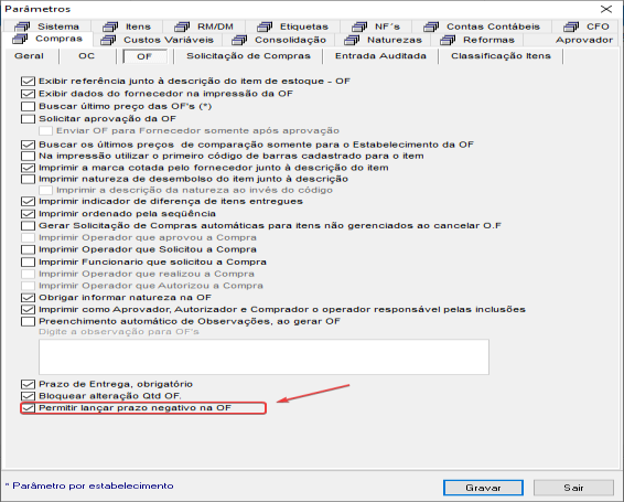 Com o parâmetro “PERMITIR LANÇAR PRAZO NEGATIVO NA OF” marcado, o sistema ira permitir o lançamento das OF com dias negativos (retroativos).