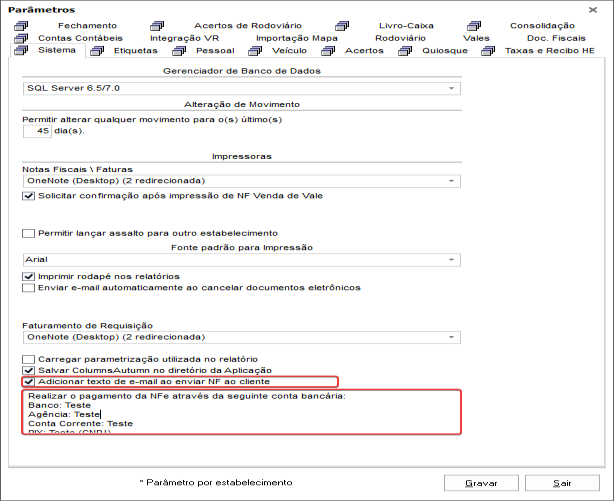 Ao marcar o parâmetro “ADICIONAR TEXTO DE E-MAIL AO ENVIAR NF AO CLINETE”, o conteúdo preenchido no campo livre abaixo do parâmetro ira complementar a mensagem automática no envio do email ao cliente. Imagens meramente ilustrativas: