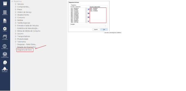 A adicionar os veículos a coluna “Veículos selecionados”, ao imprimir ira apresentar o diagrama dos eixos e seus pneus.