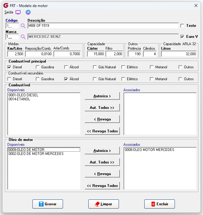 Descrição - Informe a descrição do modelo Teste - Marque esta opção para tipo de óleo utilizado em testes Marca - Digite o código da marca do motor ou clique no botão de pesquisa para selecionar Euro V - Marque esta opção para motores Euro V Médias Km/litro - Informe o consumo médio esperado para o combustível Reposição/Comb. - Informe o consumo médio esperado para a reposição do óleo lubrificante Arla/Comb. - Informe o consumo médio esperado para ARLA Capacidade Carter - Informe a capacidade em litros Filtro - Informe a quantidade utilizada por troca Outros Potência - Informe a potência Cilindros - Informe a quantidade de cilindros Capacidade ARLA 32 - Informe a capacidade do tanque de ARLA 32 Combustível Principal - Informe o combustível principal Combustível secundário - Informe o combustível secundário Combustíveis | Disponíveis / Associados - No grid disponíveis são apresentados os tipos de combustíveis disponíveis de acordo com o informado nos campos "Combustível Principal" e "Combustível Secundário" Para definir combustíveis específicos para o modelo, selecione no grid disponíveis e autorize para transferir ao grid associados. Quando não houver nenhum tipo de combustível no grid de associados, será possível utilizar qualquer combustível do grid de disponíveis. Óleo de motor | Disponíveis / Associados - No grid disponíveis são apresentados os tipos de óleo cadastrados como óleo de motor. Para definir tipos de óleo específicos para o modelo, selecione no grid disponíveis e autorize para transferir ao grid associados. Quando não houver nenhum tipo de óleo no grid de associados, será possível utilizar qualquer óleo do grid de disponíveis. Botão Gravar - Após informar os dados clique no botão gravar Botão Limpar - Utilize para limpar a tela Botão excluir - Utilize para excluir o cadastro |