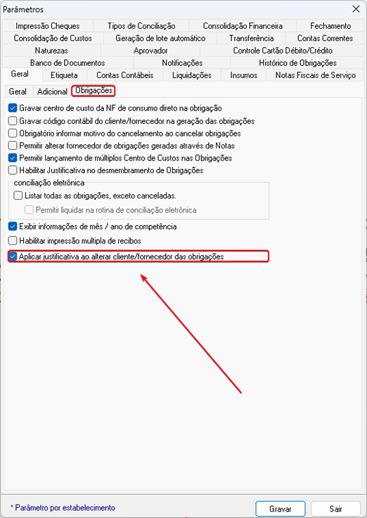 Implementado novo parâmetro para que, se marcado solicitará o motivo de alteração do cliente/fornecedor de uma obrigação. nome parâmetro: "Aplicar justificativa ao alterar cliente/fornecedor das obrigações"