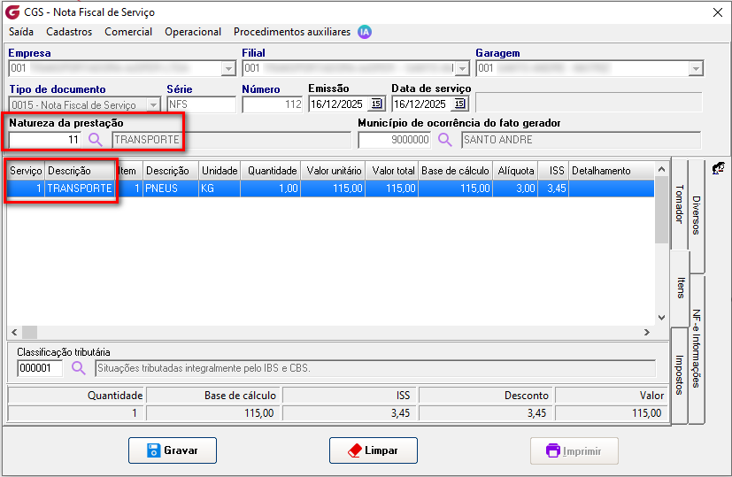 Importante: Vale destacar que, conforme mencionado, os valores das alíquotas desses impostos poderão ser atualizados posteriormente e informados pelo Governo. Diante disso, deverão ser ajustados nos respectivos cadastros indicados, conforme os links mencionados nas informações adicionais desta documentação. 4. Relatório Após a emissão dos documentos fiscais com os novos impostos, os valores correspondentes passam a ser exibidos no relatório Serviço de Frete, acessível em: Operacional → Relatórios → Serviços de Frete. Esse modelo foi baseado no modelo padrão (1) da própria rotina, preservando todos os resultados e informações já existentes, com o acréscimo dos novos campos referentes aos impostos, conforme demonstrado no exemplo abaixo: ![]() Na tela de fitro para gerar o relatório com a opção do botão 'Consultar' ![]() 5. Preenchimento automático Com o objetivo de evitar o preenchimento manual e tornar o processo mais ágil para o usuário emissor, foram criadas parametrizações que permitem padronizar o código de classificação tributária utilizado na emissão do documento fiscal. A definição do código poderá ocorrer com base nos seguintes critérios: Parâmetro Local: Tipo de Serviço:![]() Quando houver concorrência, ou seja, quando ambos os parâmetros estiverem preenchidos, o sistema aplicará a regra de maior precisão: Preferência para o Tipo de Serviço: Caso exista um código configurado diretamente no Tipo de Serviço associado ao documento fiscal, ele será utilizado. Fallback para Parâmetro Local: Se o Tipo de Serviço não estiver parametrizado, mas o Parâmetro Local sim, o sistema utilizará o código definido a nível de Garagem. Quando isso ocorrer, a alteração do usuário terá prioridade sobre qualquer parametrização configurada.