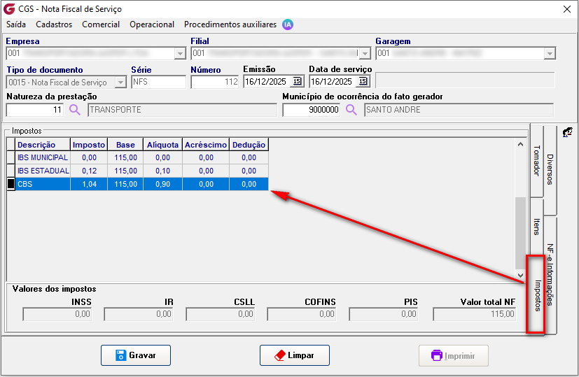 Na aba Impostos, poderá visualizar os valores calculados.