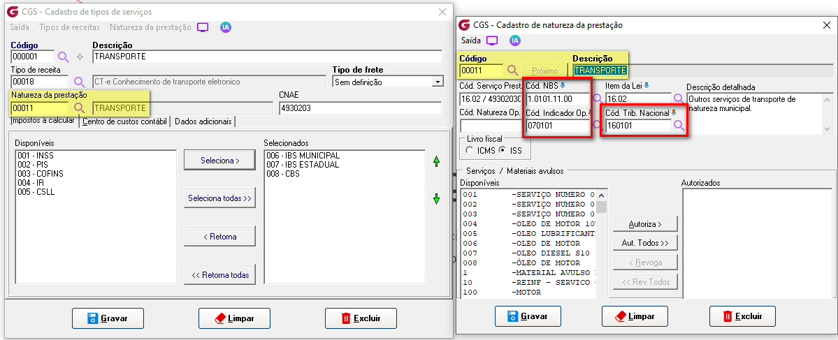 Na Manutenção de Serviços para a emissão do Nota fiscal (modelo 8) deve ser associado o tipo de serviço e indicar qual o Código de Classificação Tributária que se enquadra a partir disto o sistema buscará os respectivos impostos em meio ao cálculo: