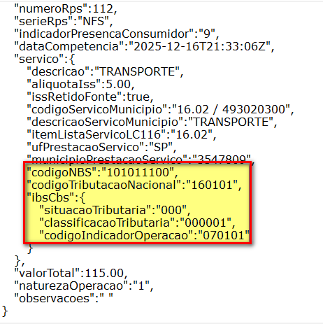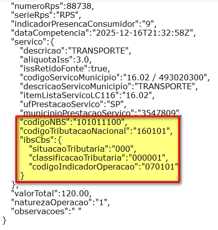 Informações NBS, Cod.Trib.Nacional , ClassificaçãoTributária no Json