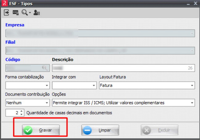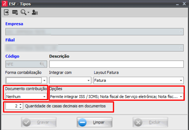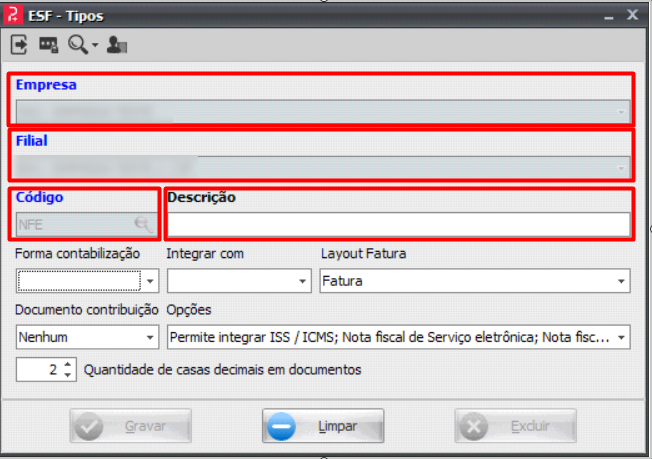 Informe Empresa e Filial, as siglas do documento e a descrição que deseja criar, na tela abaixo: