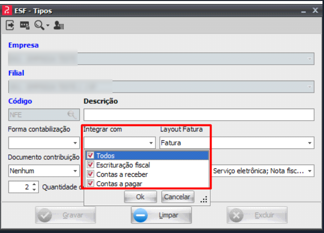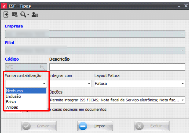 Escolha a forma de contabilização do documento. Se nenhuma, na inclusão, na baixa ou em ambas.