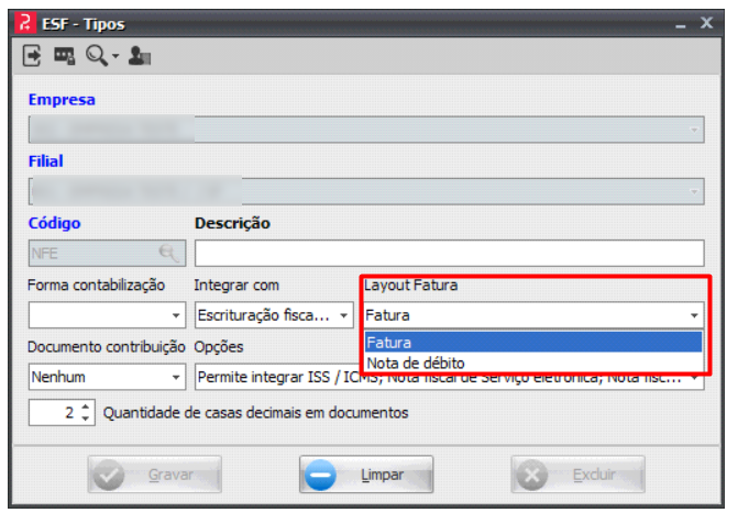 Escolha se o layout deve ser Fatura ou Nota de Débito: