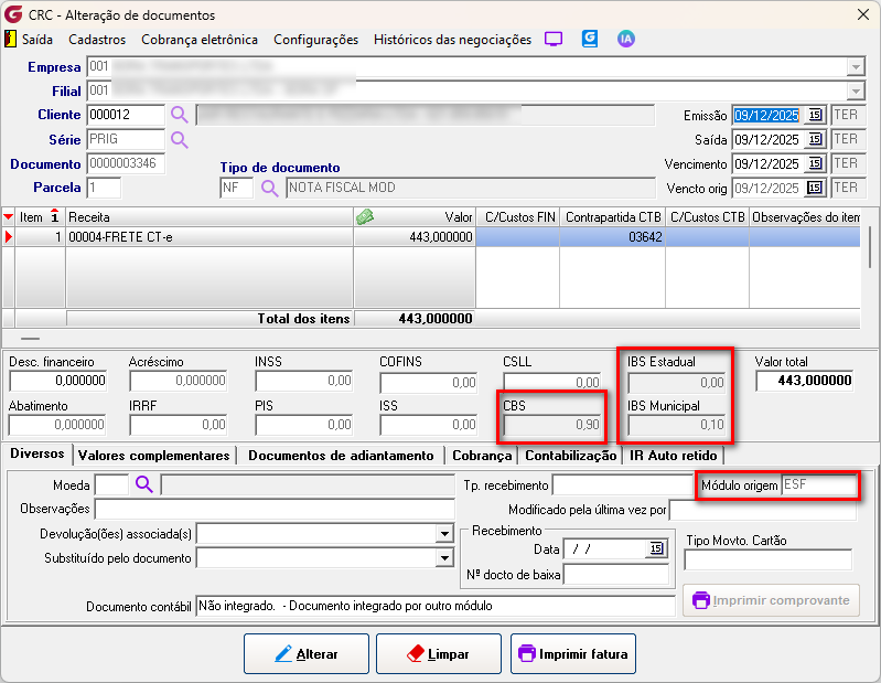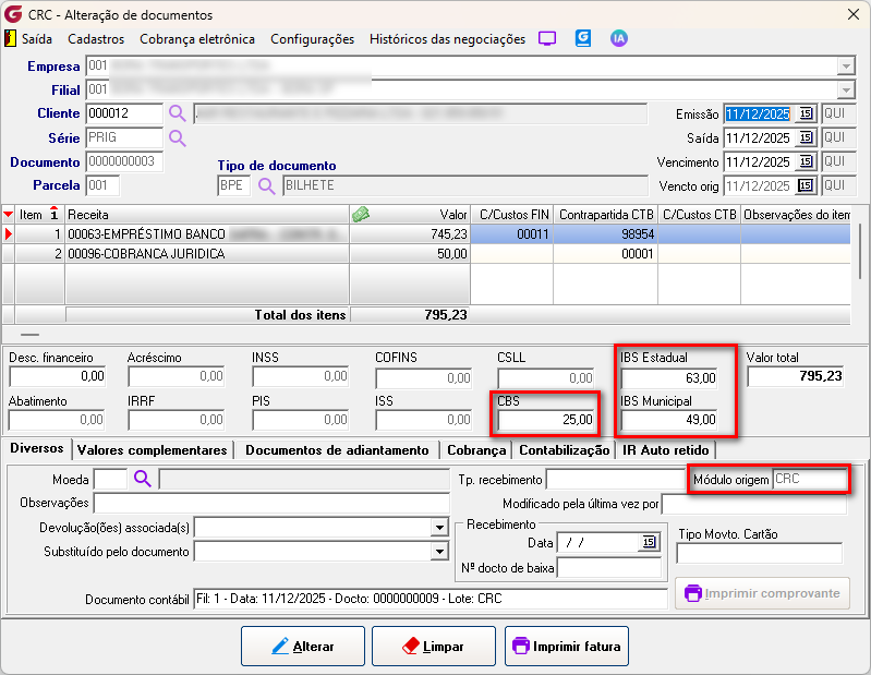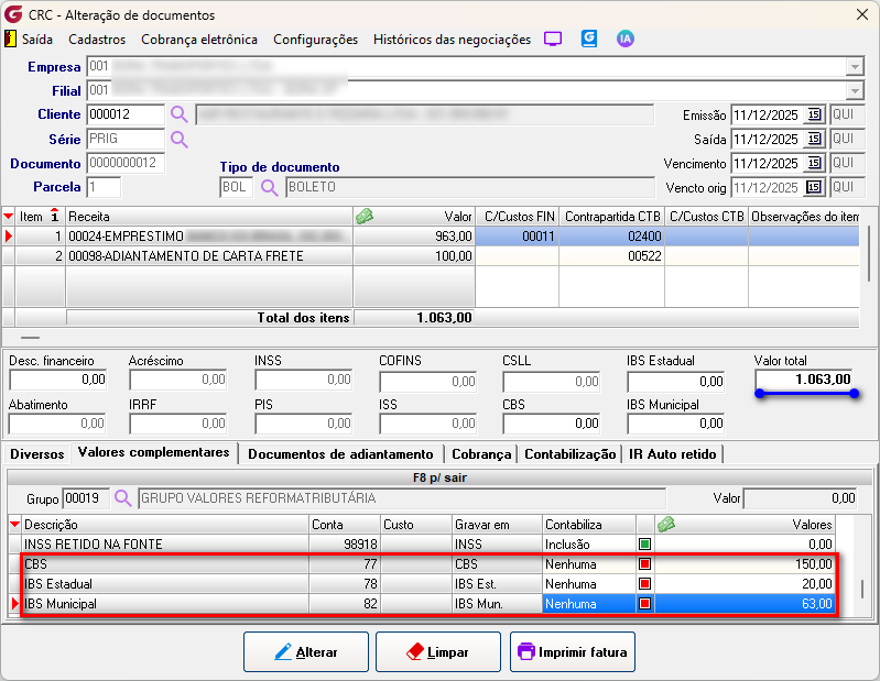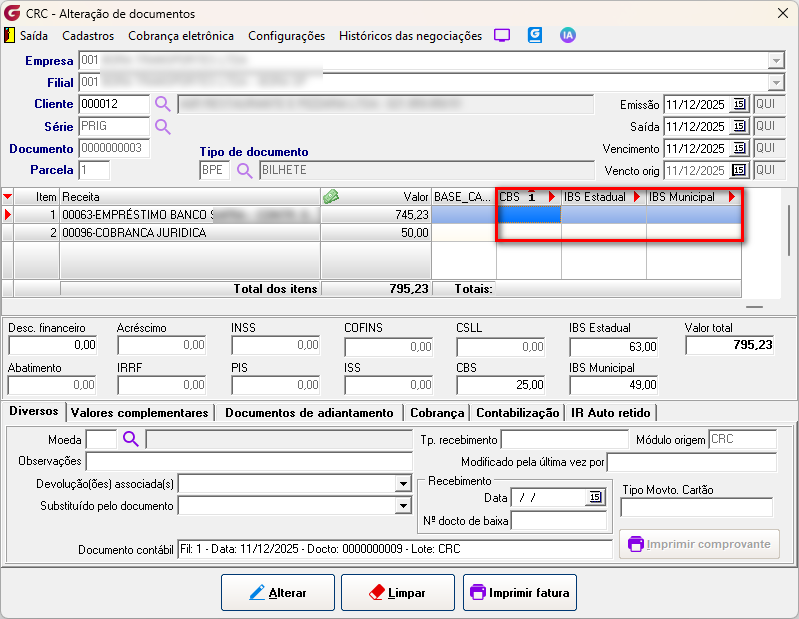 1 - Adicionados novos campos para consulta do CBS, IBS Municipal e IBS Estadual. Esses impostos não poderão ser inseridos nos itens do documento pelo Contas a Receber, mas se vierem integrados temos novas colunas nos itens para exibi-los. Caso o documento seja de origem Contas a Receber, os impostos poderão ser editados, do contrário não poderão. Documento com valor complementar Os valores dos impostos não serão deduzidos do valor bruto do documento. Além disso, ainda não estamos executando a contabilização desses valores. A edição será apenas de documentos origem CRC e que estejam em aberto. Demais documentos integrados não permitirão edição dos valores dos impostos já calculados.