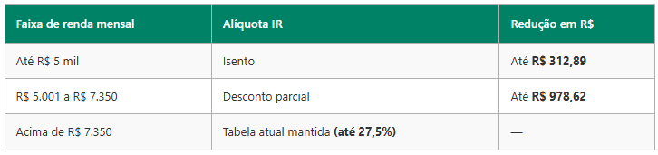 1.1 Ampliar a faixa de isenção para rendimentos até R$ 5.000,00 mensais. Criar mecanismo de redução progressiva para rendas intermediárias (até R$ 7.350,00). 1.2 Tributar lucros e dividendos acima de R$ 50 mil mensais. A medida entra em vigor em 01/01/2026, com impacto na Declaração de Ajuste Anual de 2027 (ano calendário 2026). 2. Principais Alterações 2.1 Faixa de Isenção Rendimentos tributáveis mensais até R$ 5.000,00: isentos de IR. Benefício também se aplica ao 13º salário. 2.2 Faixa de Transição (R$ 5.000,01 a R$ 7.350,00) Aplicação de redução decrescente para suavizar a tributação. Fórmula oficial: Redução limitada ao valor do imposto devido (não gera crédito negativo). 2.3 Acima de R$ 7.350,00 Sem redução. Aplicação da tabela progressiva tradicional (alíquotas de 7,5% a 27,5%).