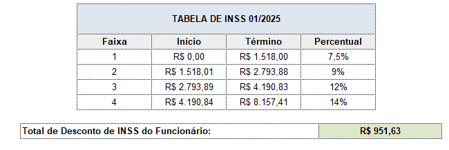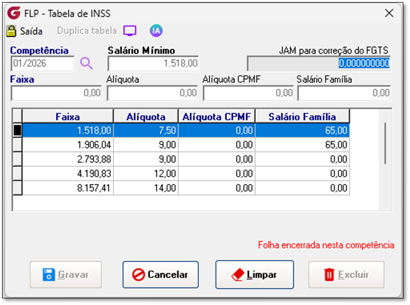 Tabela atualizada de INSS Menu: Procedimentos Mensais>> Atualização de Tabela>> INSS Competência: 01/2026 1ª faixa salarial: R$ 0,00 a R$ 1.518,00 - Alíquota de 7,50% 2ª faixa salarial: R$ 1.518,01 a R$ 2.793,88 - Alíquota de 9,00% 3ª faixa salarial: R$ 2.793,89 a R$ 4.190,83 - Alíquota de 12,00% 4ª faixa salarial: R$ 4.190,84 a R$ 8.157,41 - Alíquota de 14,00%