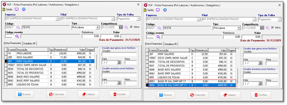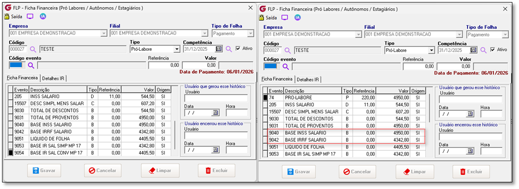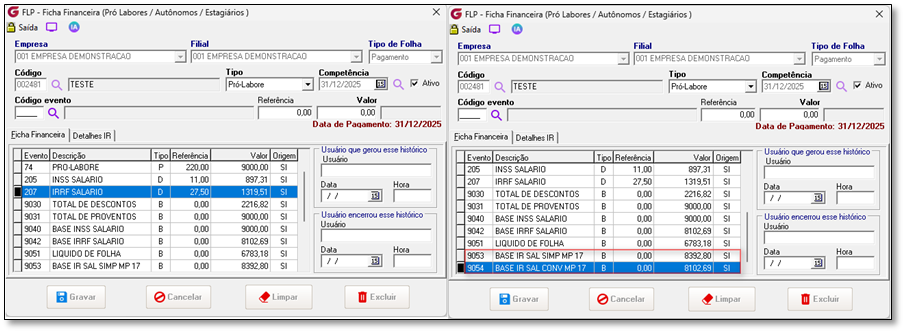 Cenário 4: Rendimento maior que R$ 7.350,00. Pró-Labore Cenário 4: Cálculo do IRRF para rendimento de R$ 9.000 Dado que o funcionário tem um rendimento tributável de R$ 9.000,00 Quando o sistema calcular o IRRF Então não deve alterará o cálculo do IRRF, manterá o cálculo atual. Memória de cálculo atual Data de Pagamento em 31/12/2025