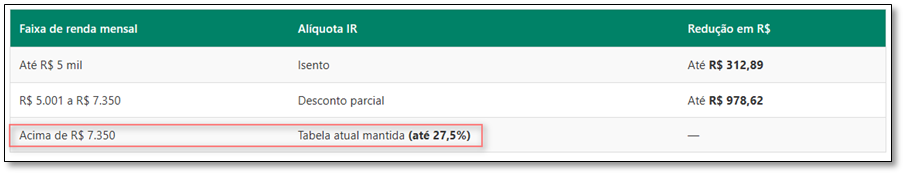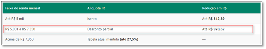 O que muda no cálculo da folha de pagamento Diferente de apenas mudar a tabela progressiva, o governo criou um mecanismo de “Redução do Imposto” que funciona como um desconto decrescente. Isso evita que, quem ganha R$ 5.001,00 pague uma alíquota cheia repentinamente. O cálculo é realizado da mesma forma que já vem sendo feito, o mecanismo de redução entra após o cálculo, onde é aplicado a redução conforme a tabela abaixo.