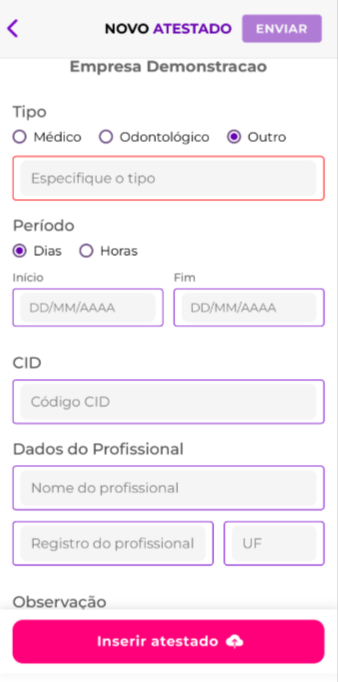 Obs.: Os dados do atestado — Dias, Horas, CID, Nome do Profissional e Registro do Profissional — terão o preenchimento manual inicialmente bloqueado. Essas informações serão preenchidas automaticamente pela I.A. (Inteligência Artificial) no momento em que o usuário anexar o atestado. Após o preenchimento automático, será permitida a edição dos campos Dias, Horas, Nome do Profissional e Registro do Profissional, não sendo permitida a edição do campo CID. 4. Inserção do Atestado Após preencher todos campos obrigatórios e anexar o atestado, o usuário deve clicar no botão 'Enviar'. Este passo registra o atestado no sistema.