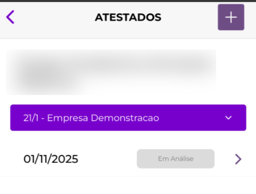 Atestados No Tá.On, o botão 'Atestados' permite que o colaborador registre um novo atestado diretamente pelo aplicativo, de forma simples e padronizada, incluindo a possibilidade de anexar o documento de atestado. Ao acessar a tela de Atestados, o usuário visualizará um botão '+' (Inserir) no canto superior da tela.