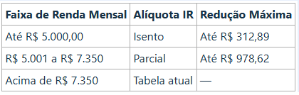 2.1 Faixa de Isenção Rendimentos tributáveis mensais até R$ 5.000,00: isentos de IR. Benefício também se aplica ao 13º salário.