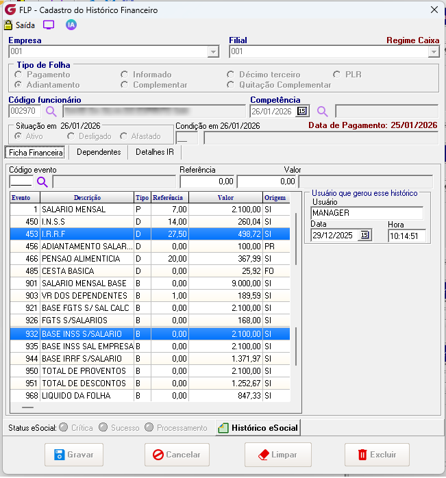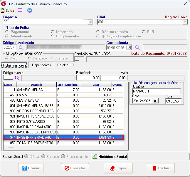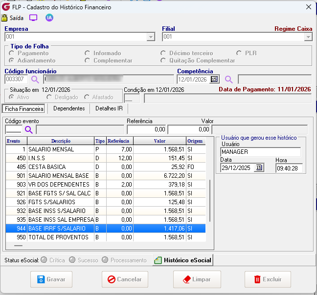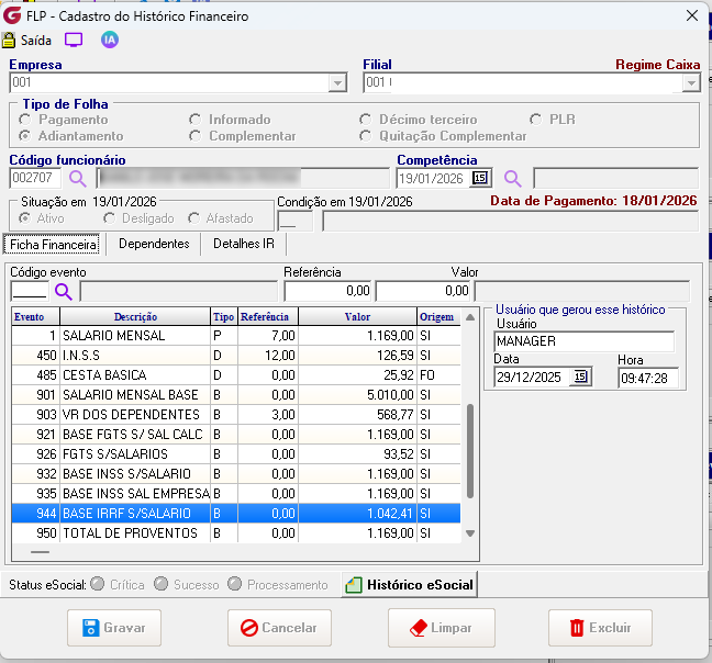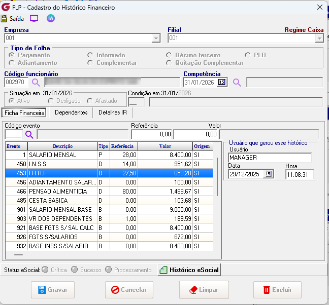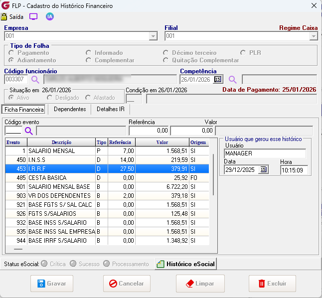 Novo valor do IRRF: R$ 523,17 - 143,26 = 379,91 R$ Menu: Cadastros>> Funcionários>> Histórico Financeiro