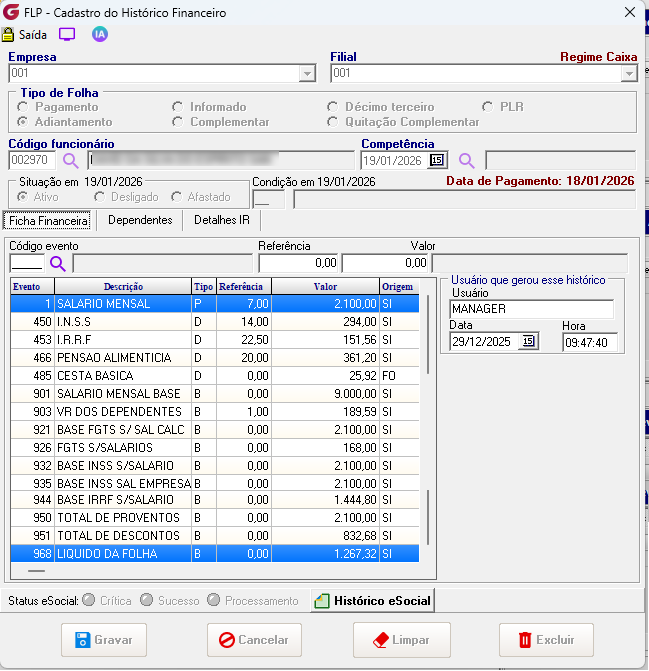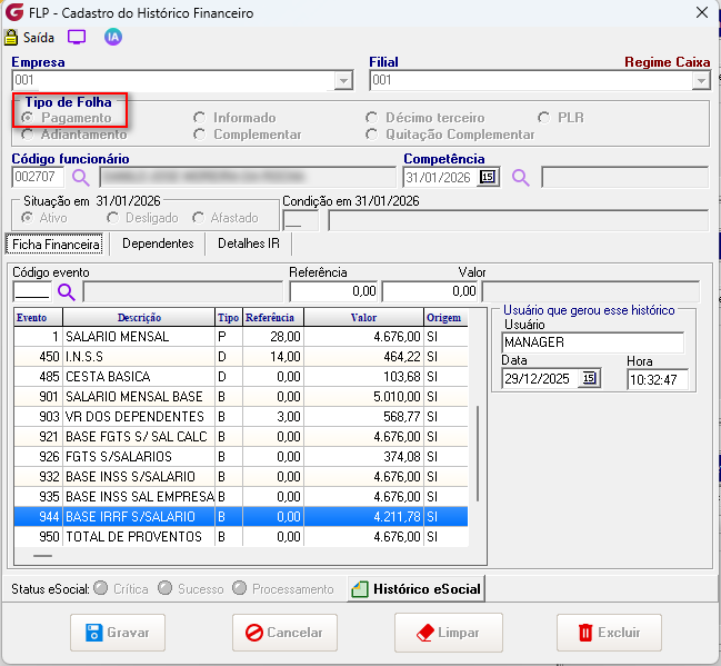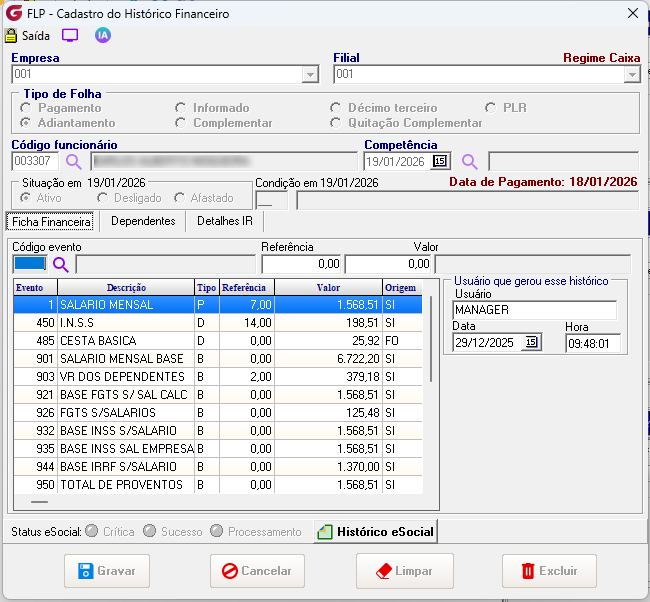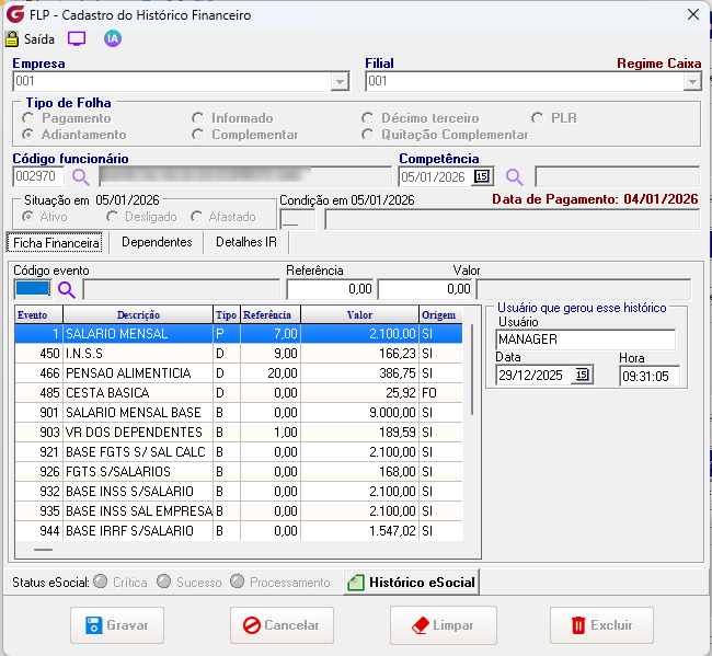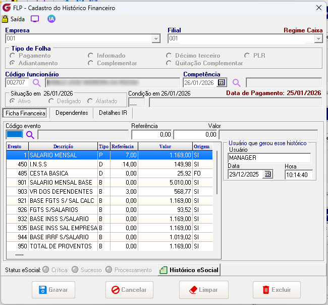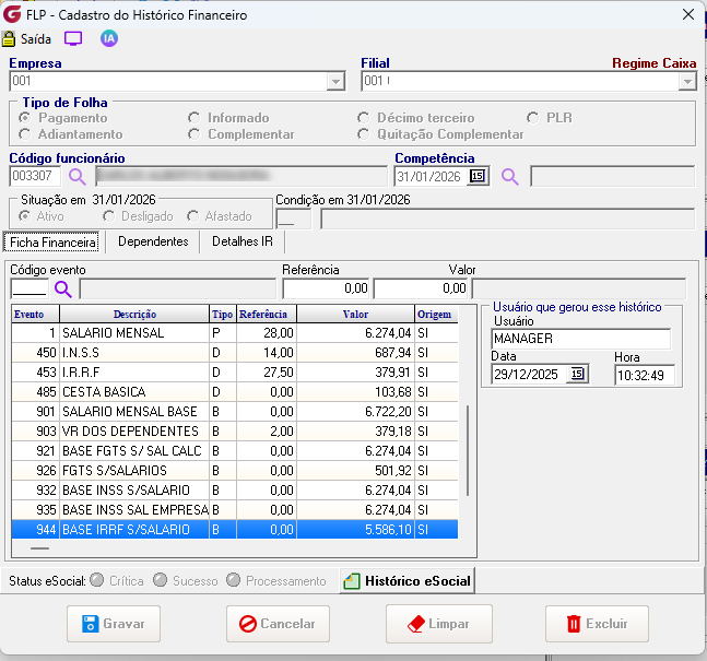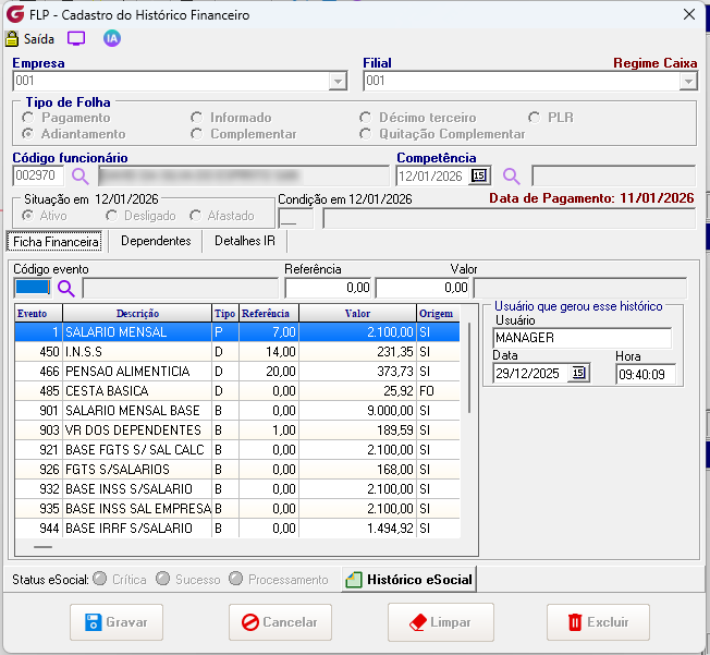 Menu: Cadastros>> Funcionários>> Histórico Financeiro