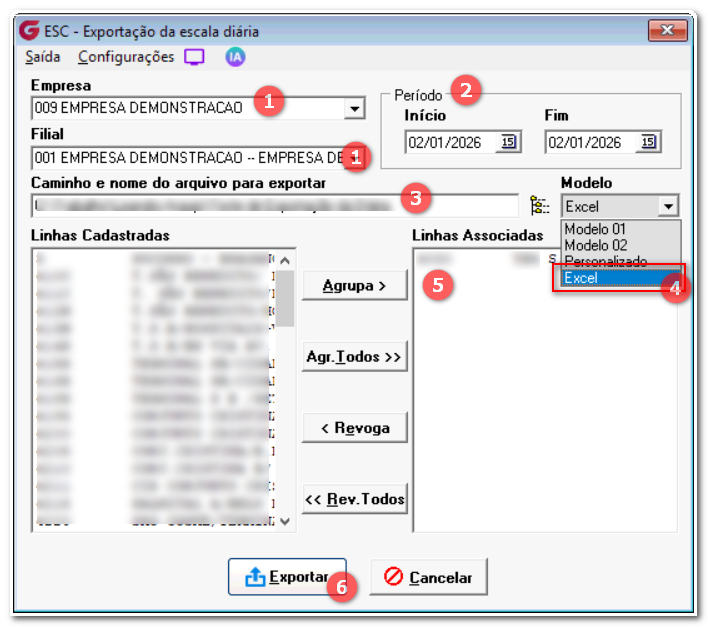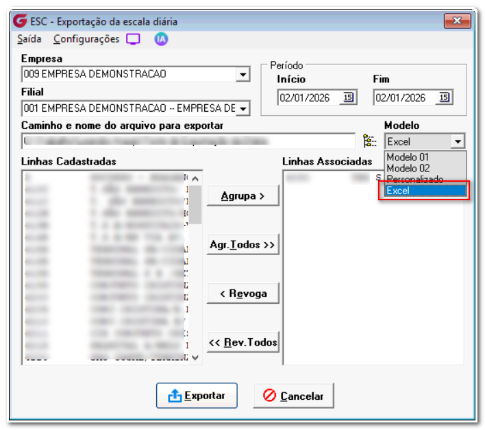 Na Tela de Exportação da Escala Diária foi incluído no Campo Modelo a opção de (Excel), ao selecionar esta opção o arquivo gerado será no formato xlsx.