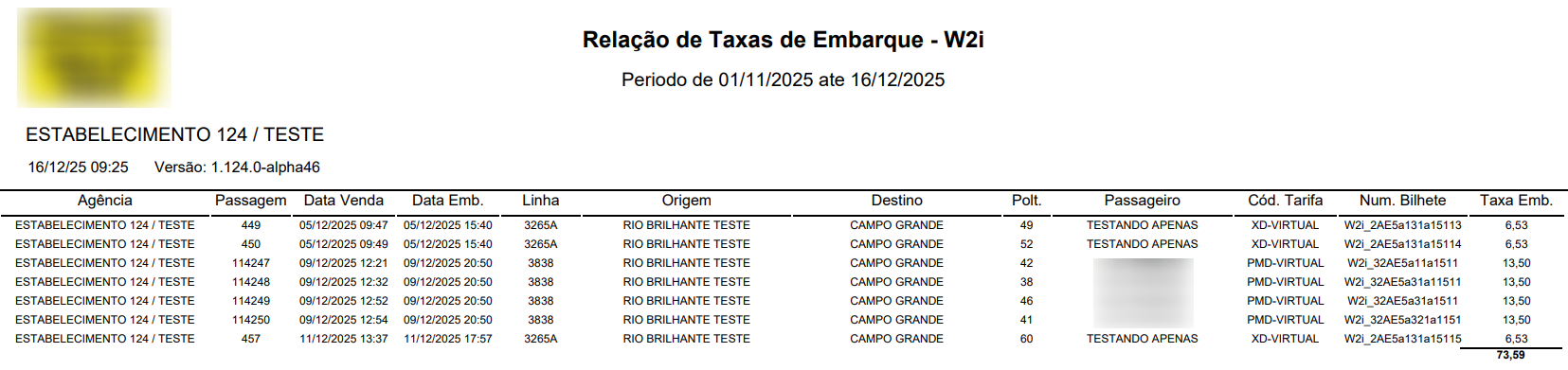 Implementação do novo modelo de relatório “Taxa de Embarque W2i” O que há de novo: Foi adicionado ao conjunto de relatórios financeiros do Portal Web Luna ADM o novo relatório “Taxa de Embarque W2i”. Esse modelo foi desenvolvido para aprimorar a análise dos registros, proporcionando maior precisão e eficiência no controle das taxas consumidas. O relatório apresenta as seguintes informações: Agência, Passagem, Data da Venda, Data de Embarque, Linha, Origem, Destino, Poltrona, Passageiro, Código da Tarifa, Número do Bilhete e Taxa de Embarque.