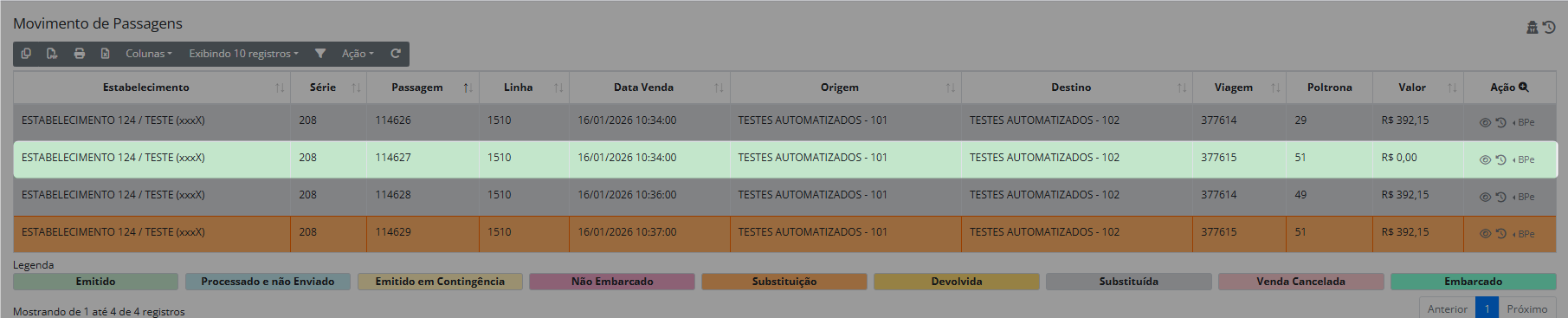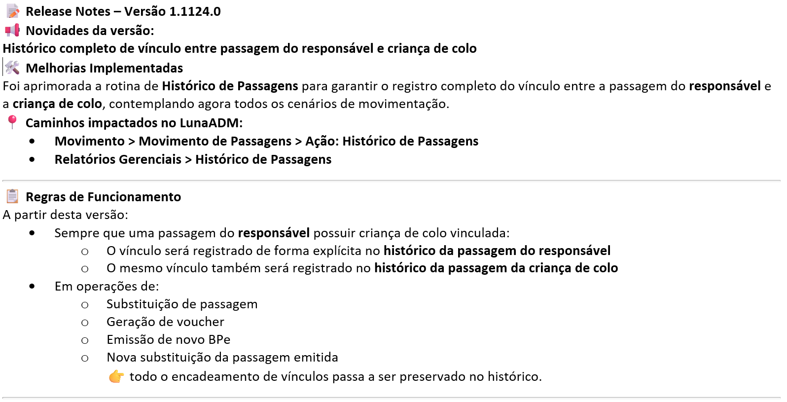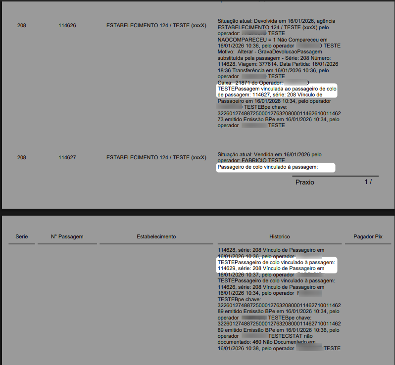 Ilustrações acima demonstrando o vínculo das passagens do responsável pela criança e a criança de colo tanto nas situações de venda quanto nas transferências. 1º Caminho em visualizar histórico de passagens no movimento de passagens; 2º Exibiição do histórico de passagens contendo os vinculos; 3º Exibição do relatório Gerencial de Histórico de Passagens. Aprimorando assim, o rastreamento da passagem da criança de colo em situações de transferências e substituições das passagens dos responsáveis. *Portal Web Luna ADM. Nomes, documentos e telefones lançados nesse teste, são meramente fictícios. “Atendendo assim as normas da LGPD”. |